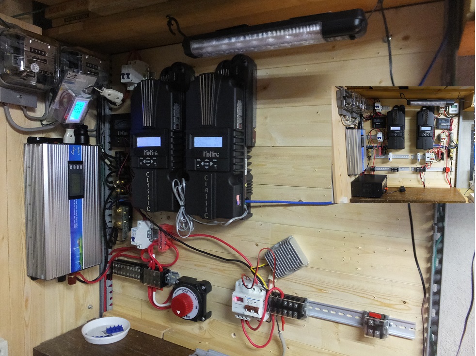 パネルの発電量の異なるシステムが2系列持つことになった。 従来システム パネルPana 485W(240W+245W)並列から直列で105.7V 6.00A コントローラ Classic 200(Midnite:USA) バッテリー (115Ahx2)X2 (24V) 増設システム パネルSharp 1141W(163Wx7) 直列179.4V 25.63A コントローラ Classic 200(Midnite:USA) バッテリー 115Ah x 4 (48V)