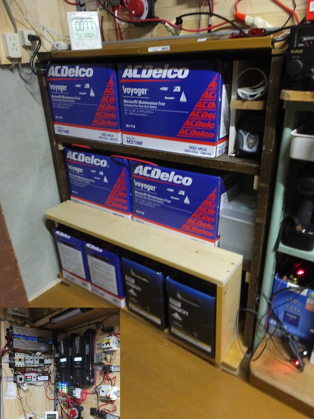 以前から気になっていたが、二組のバッテリーバンク。12Vのバッテリーを四つ直列に結び、これが二組ある。
