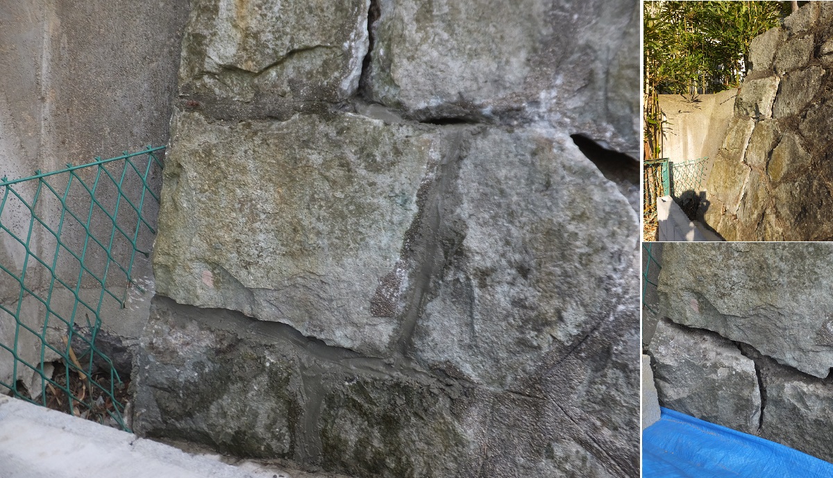 石の間のコンクリートをはつり、隙間のコンクリートをはがす。 バケツで作ったモルタルをその間に流し込む。場所により、30cmほどで、バケツ半杯のモルタルを使う。石の後ろに空洞ができているところに流し込む。
