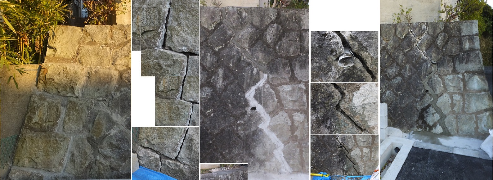 以前より、裏の擁壁と石垣に亀裂が入っていたのだが、隣接する家がなくなり、分譲地として整地されたため、擁壁と石垣が目につき、亀裂も気になってきた。