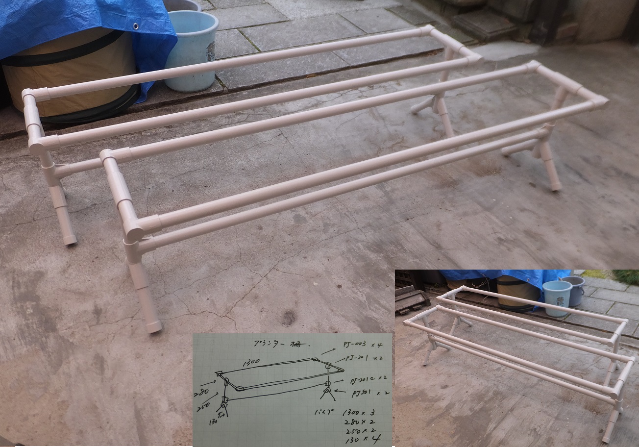 今回は、パイプの組み合わせで製作した。 必要な長さのパイクを切り取り、プラスチックの接続部品で、組み立てる。