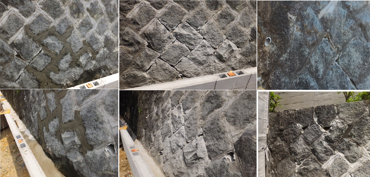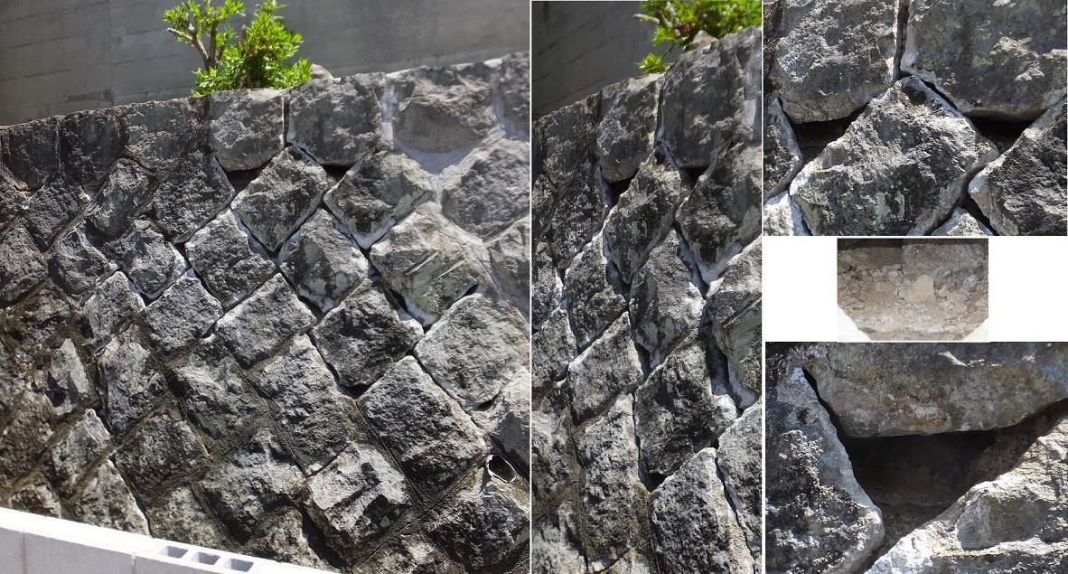 古い石と石との間のセメント(コンクリート)をはがして、モルタルを詰めていく単純な作業であるが、古いセメントが、なかなか取れない。石用のハンマーやタガネを使って外していく。