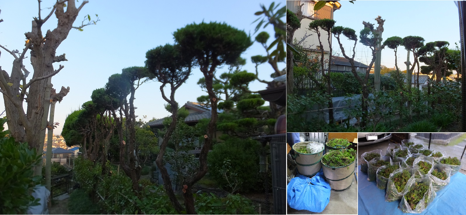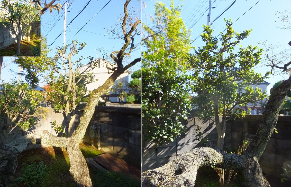 つばき:剪定はこの時期ではないが、春に剪定をした直後、気候不順のため、はが委縮したようになり、あえて、この時期に強剪定を行う。