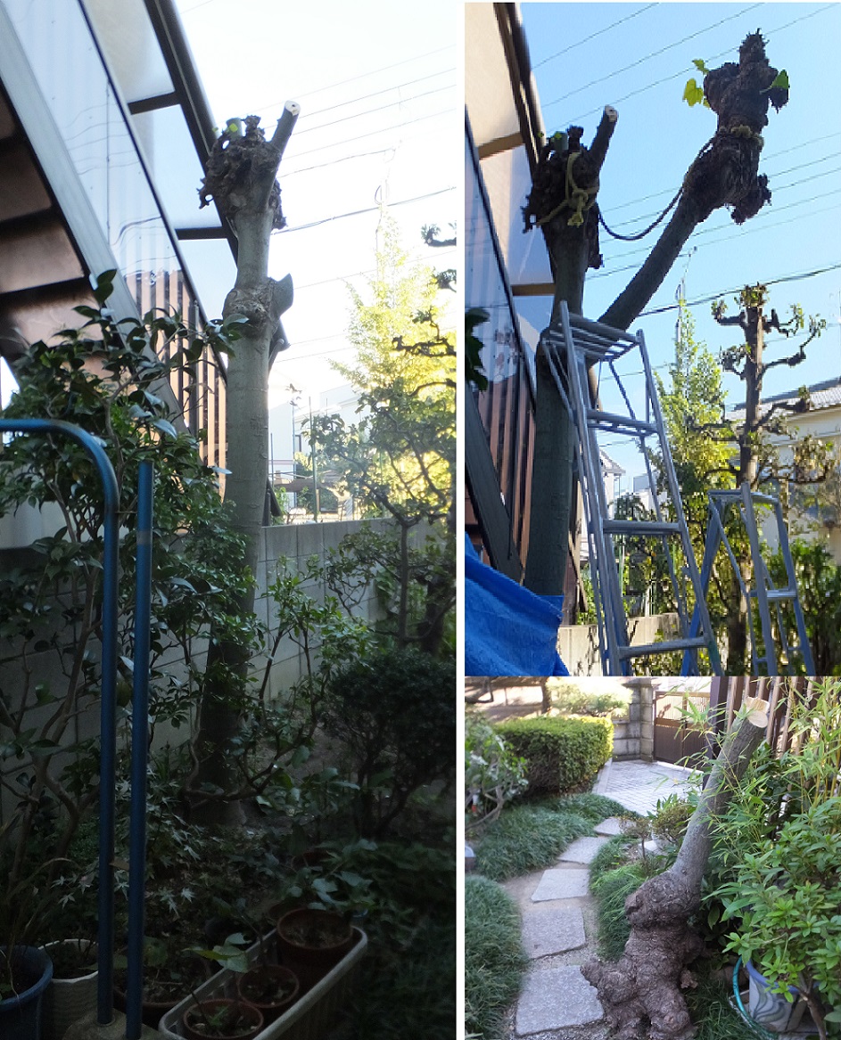 金木犀:全体を小さくするため、幹の上部を場沙里ばさりと、おおばさみで切断。すっきりとし、中心の幹まで十分に陽が差し込むようになる、