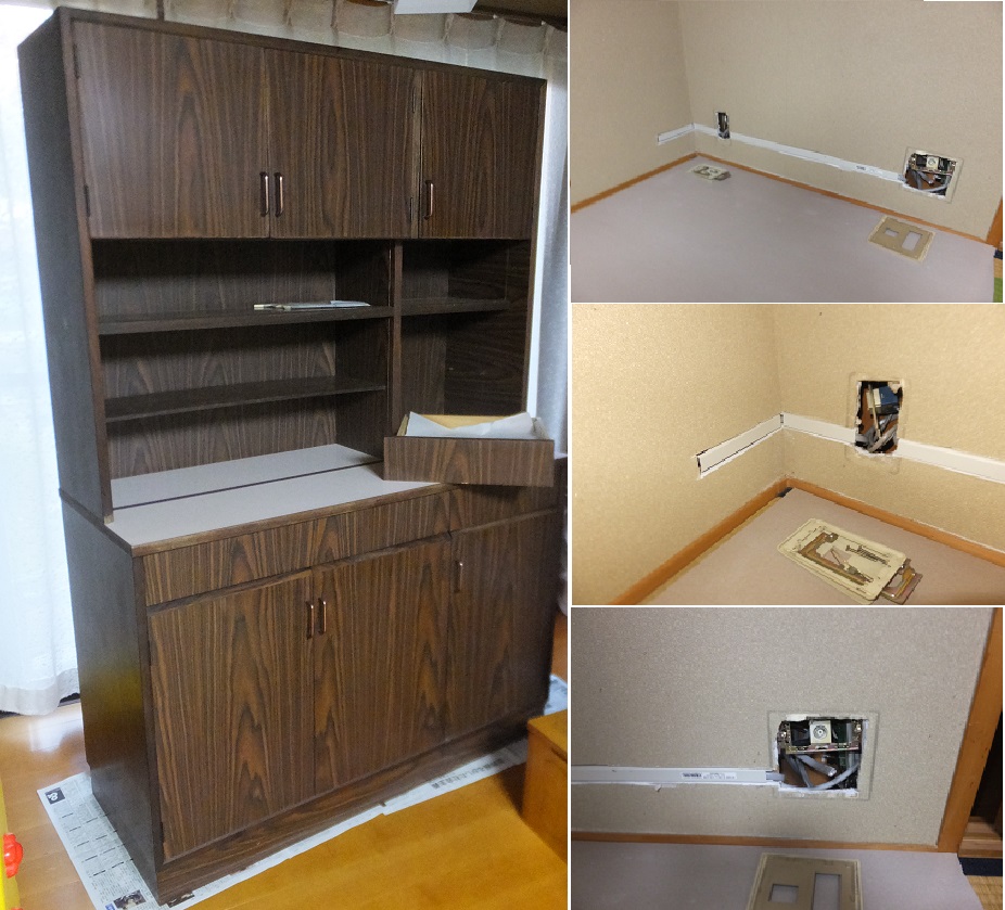 離れの壁紙のリフォームを機に、模様替えをいくつかする。先代の家から引き続き使用中の食器棚。壁の間口より広いため飛び出ている。四分の三の大きさに小さくする改造を行う。