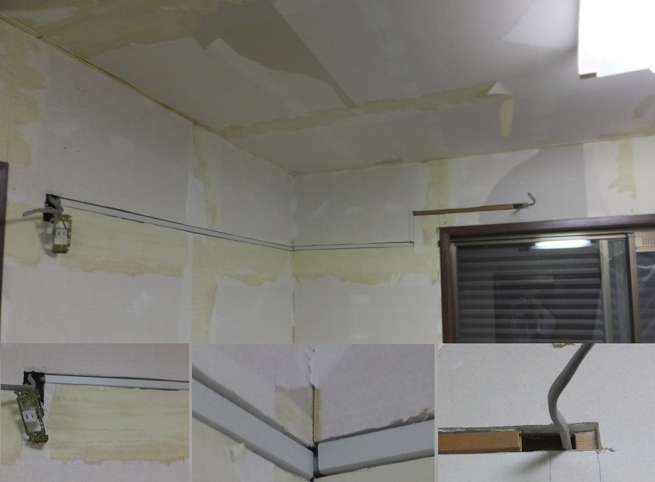 離れの洋室に、エアコンを取り換える。設置場所を変えたため、コンセントが遠くなる。当初、かべに穴をあけて外壁から回す予定であったが、前日の壁埋め込みがうまくいったので、これも実施。