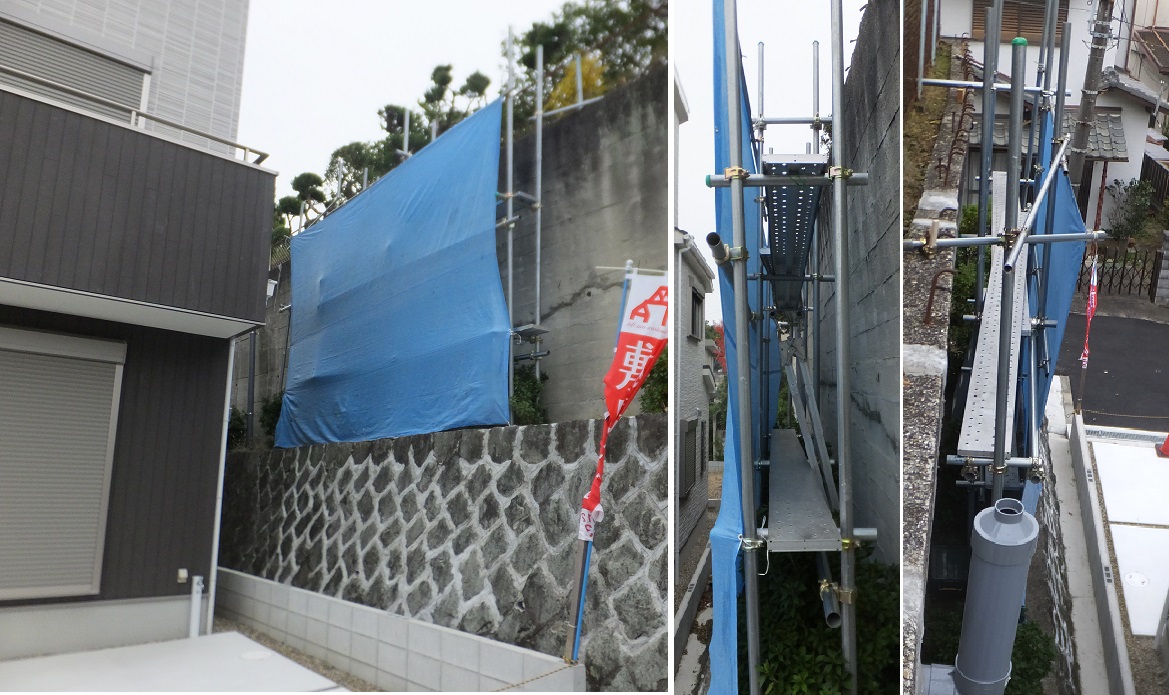 足場の組立、雨の中断のあと、朝から一気に仕上げる。