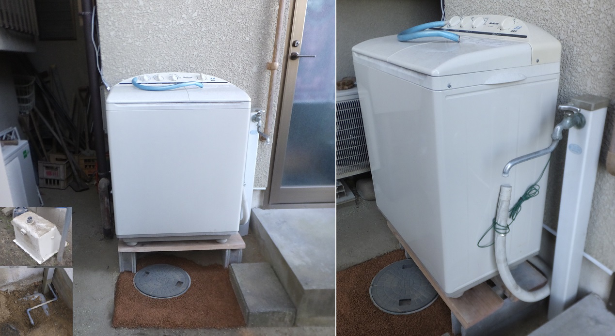 剪定や、土木作業で汚れた作業着の洗濯ができるように、古い洗濯機を活用すべく、洗濯機置場を設置した。