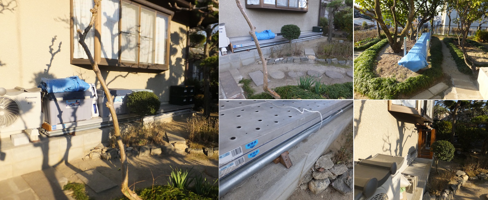 以前は、勝手口に保管していた丸管を、今年の選定が終わった後、最終的に出窓下に置く予定で柿の木の下に一時保管していたが、タイヤ置場が出来上がったので、出窓下がきれいに空けて移設した。一部エアコンの位置が邪魔をしていたが、たまたま顔を出されたなじみの電気屋さんに頼んで、20cmばかり移動をお願いして、きっちりと置けるようになった。