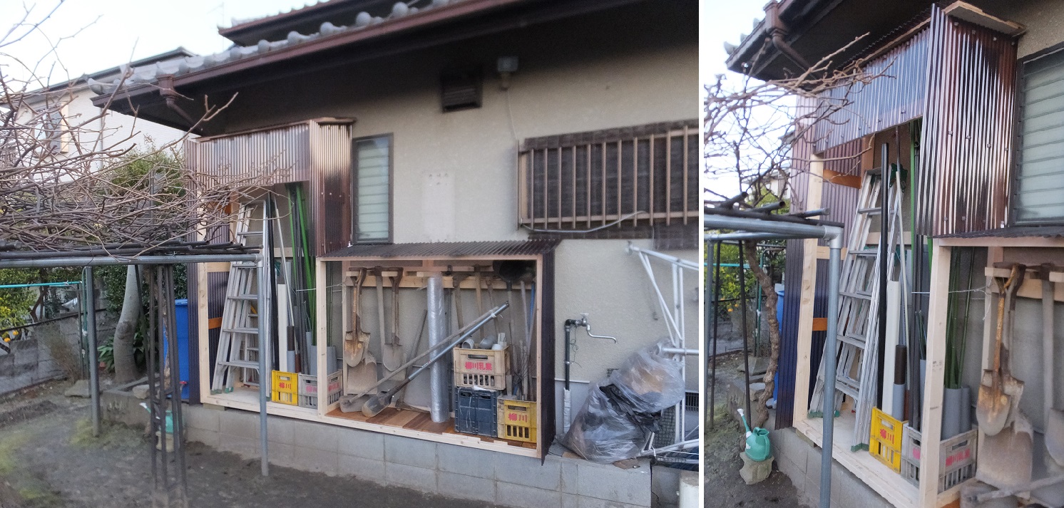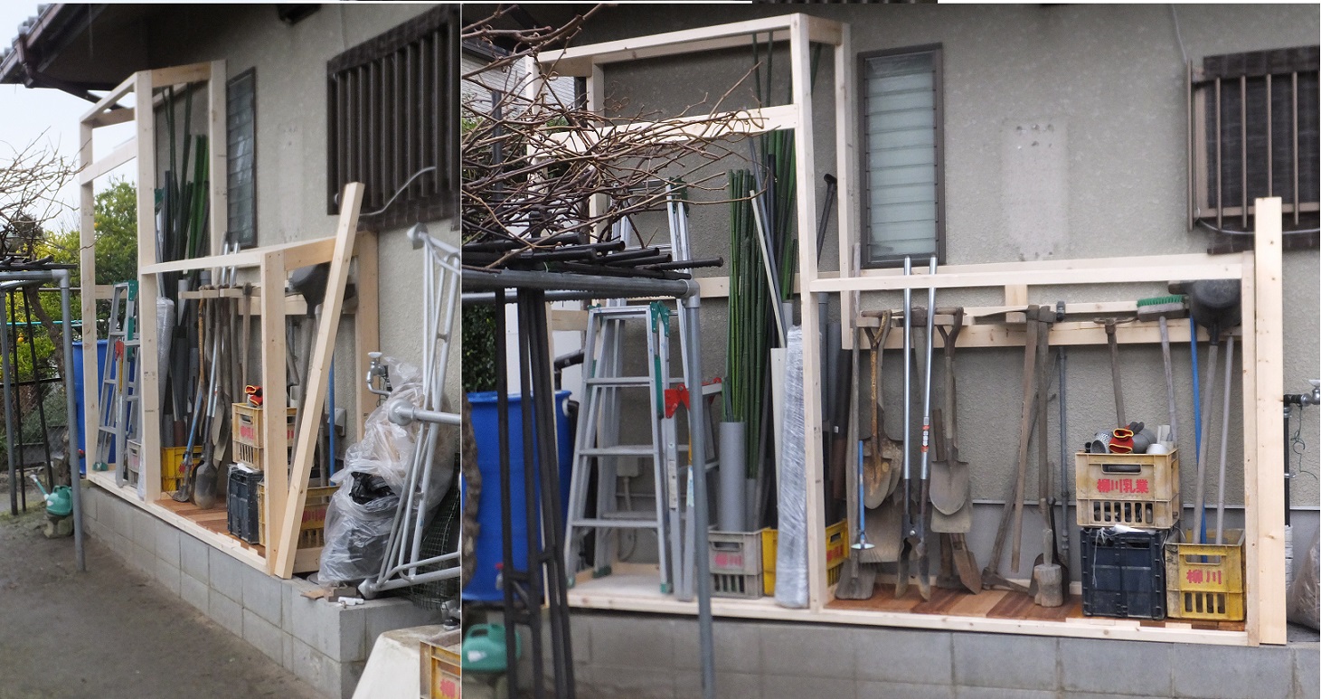 やっと完成です。 「散乱している農機具を隠したい。」から始めたが、家の裏側の、特に冬場では寒いため、近寄らなかった場所。少しは、日の目を見ればいいのだが。