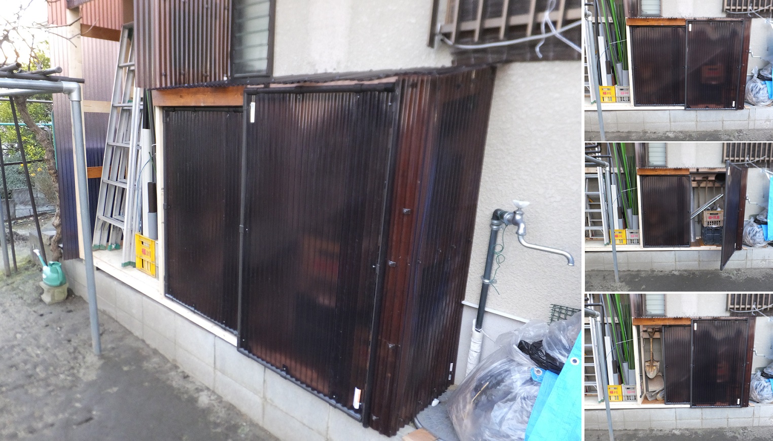 パイプと波板で、左の扉は、スライド扉、 右の扉は、開き戸にした。当初両方とも開き戸にしようかと考えていたが、スコップ一つとるのに、開き戸をあけてというのは大変かな。スライドであればすぐに取れるかなと考えて構想を練る。