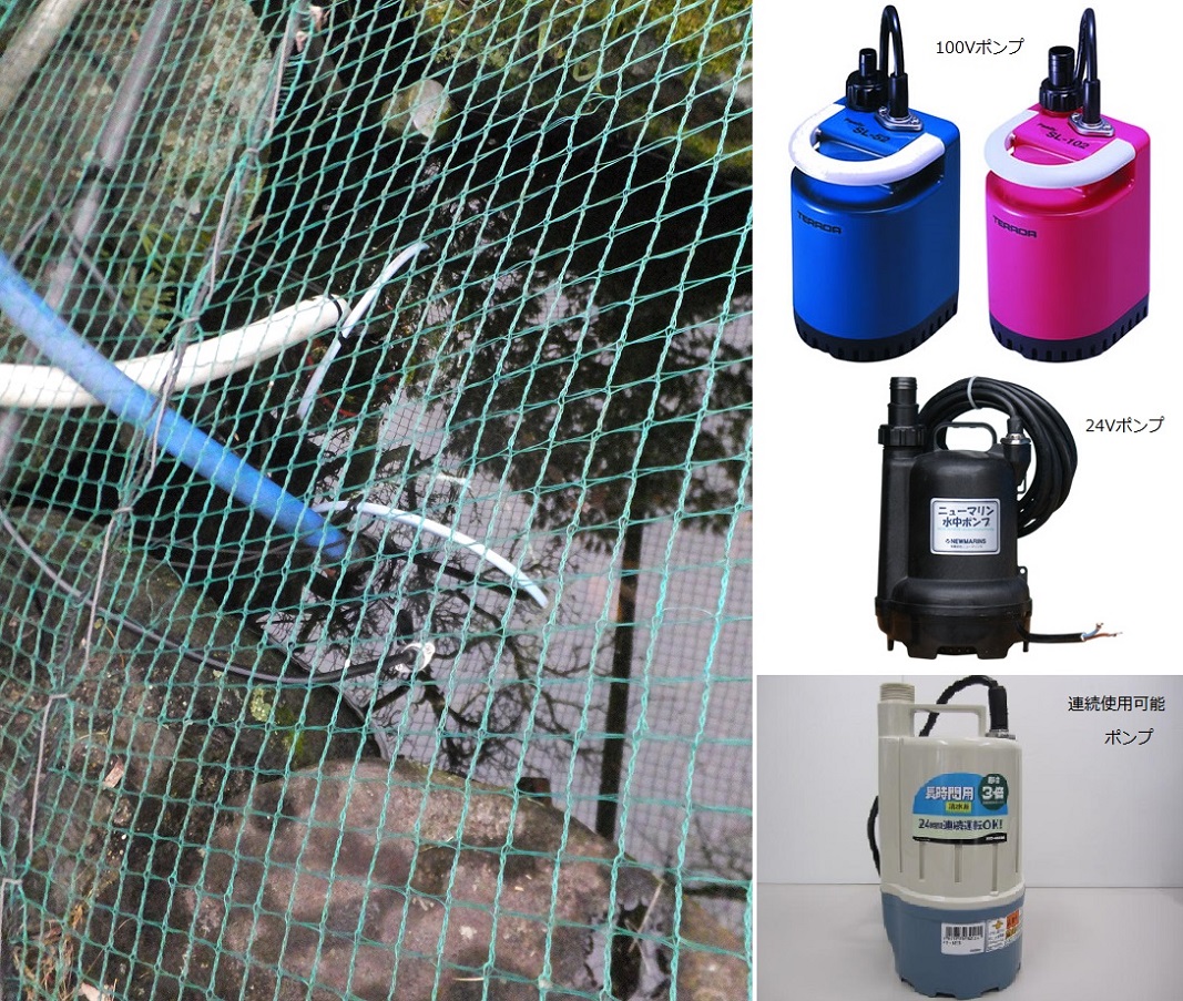 一つは、100Vの市販のポンプ。もう一つは、太陽光発電を始めてから使用しだした海水(船舶)用の24Vのポンプである。