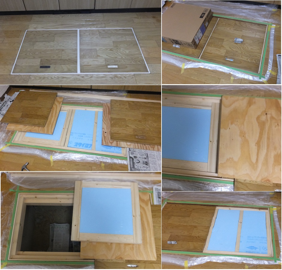 離れの台所。使用されていない床収納。隙間から冷たい風が入ってくる。いっそのことつぶそうと撤去作業を開始。