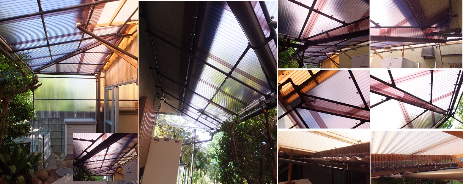 暑い最中、屋根身は銀色のシートで光を避けて、波板を取り付けていく。
