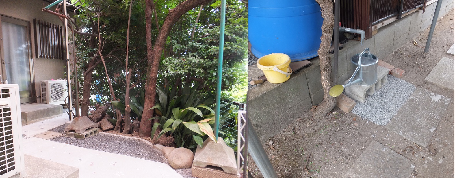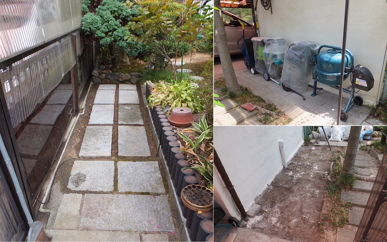 敷石をどけて、コンクリート打ちにするように敷石を外した。一部を旧バイク置き場に設置し、整理整頓する。