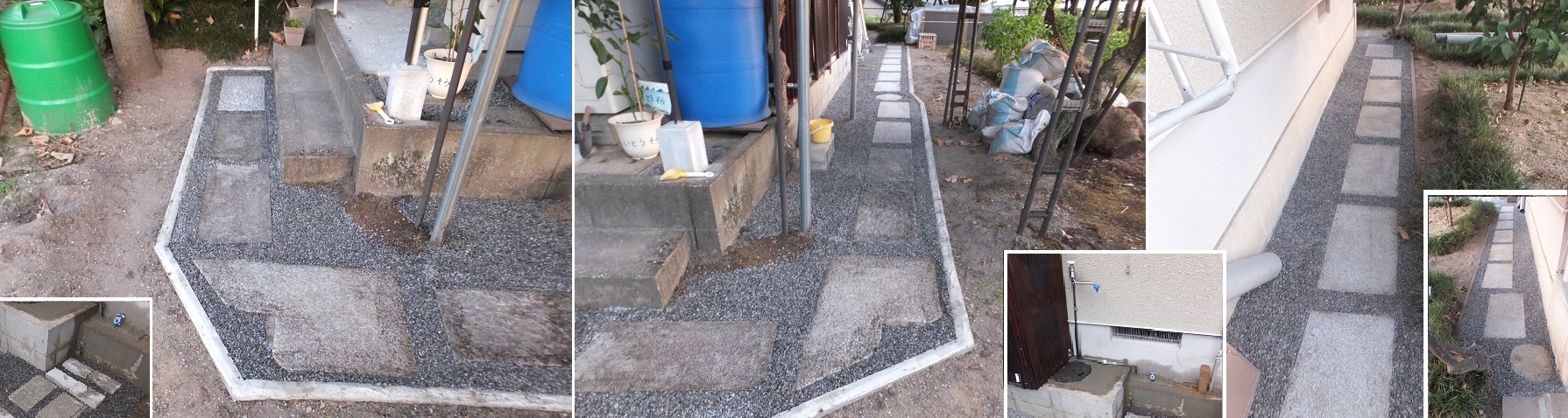 裏の敷石の設置・ジャミで囲い、固め液で固めでやっと完成