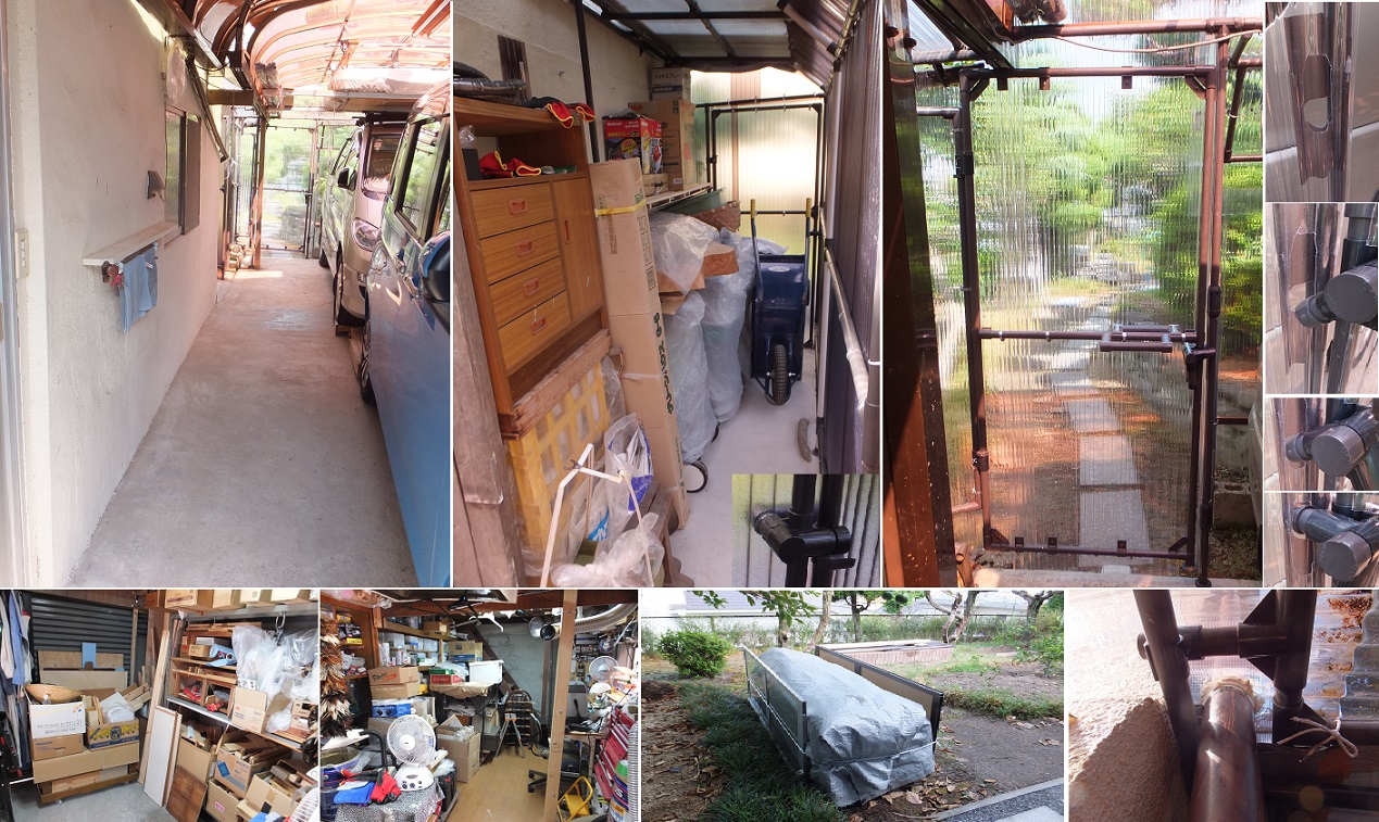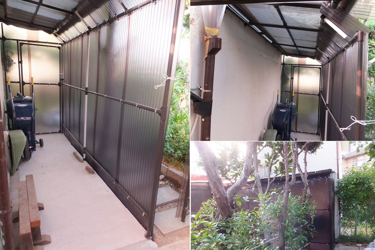 1.新しく作ったシュレッダー置場に棚 ・園芸用スプレー置き場とした 2.カーポートとシュレーダー置場の扉に鍵を ・カーポートには以前使っていた部品の活用を ・大きな穴をふさぐ工夫を 3.カーポートの扉の上部と下部に雨除けを