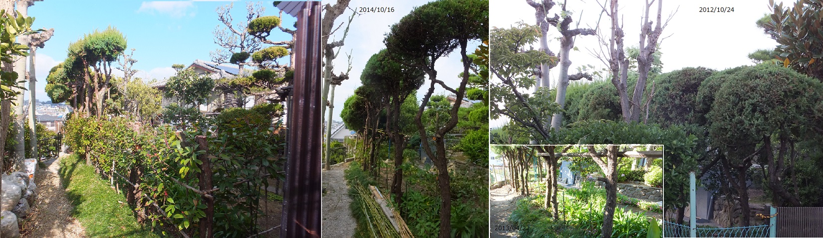 剪定を始めたころ(2010年)足元には何もなくて頭だけが大きくなったカイズカイブキ。ゆくゆくは、敷地の境界線に植えられていたが、足元の枝を切り取って2013年4月に紅かなめを植えた。