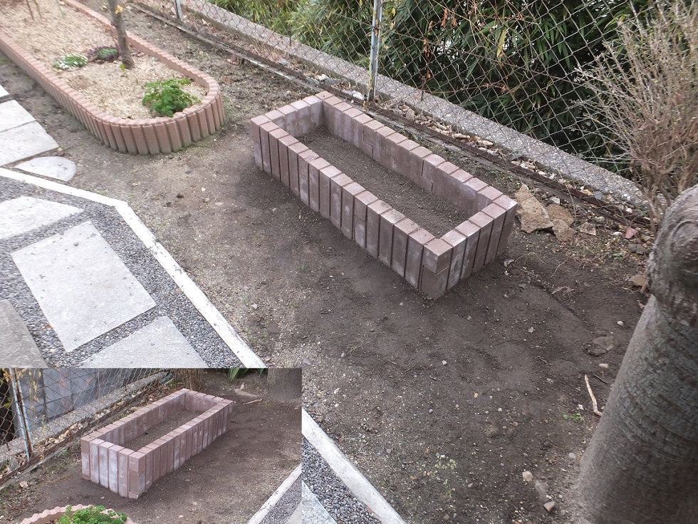 堆肥置場を作ろうと余ったブロックでくみ上げていくとサイズが小さい。それならば、菜園(花壇)にしようと用途を変えて製作したミニ菜園。花壇の活用になればいいな・・・