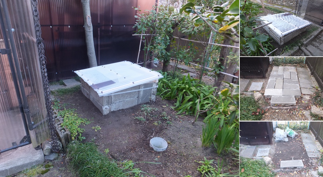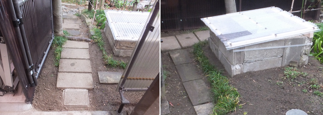 泰山木の横に、堆肥置場ができ、一週間ほど前に、カーポートの扉も完成。以前から気になっていたこの場所の敷石は、大谷石の塀を一部改造した時に出た冠の石を並べて作ったため、歩幅と異なっており、こちょこちょと歩く感じで、歩きにくい場所になっていた。途中に根っこが地表に出ているため、敷石の置き方にも黒をしたとこ度である。