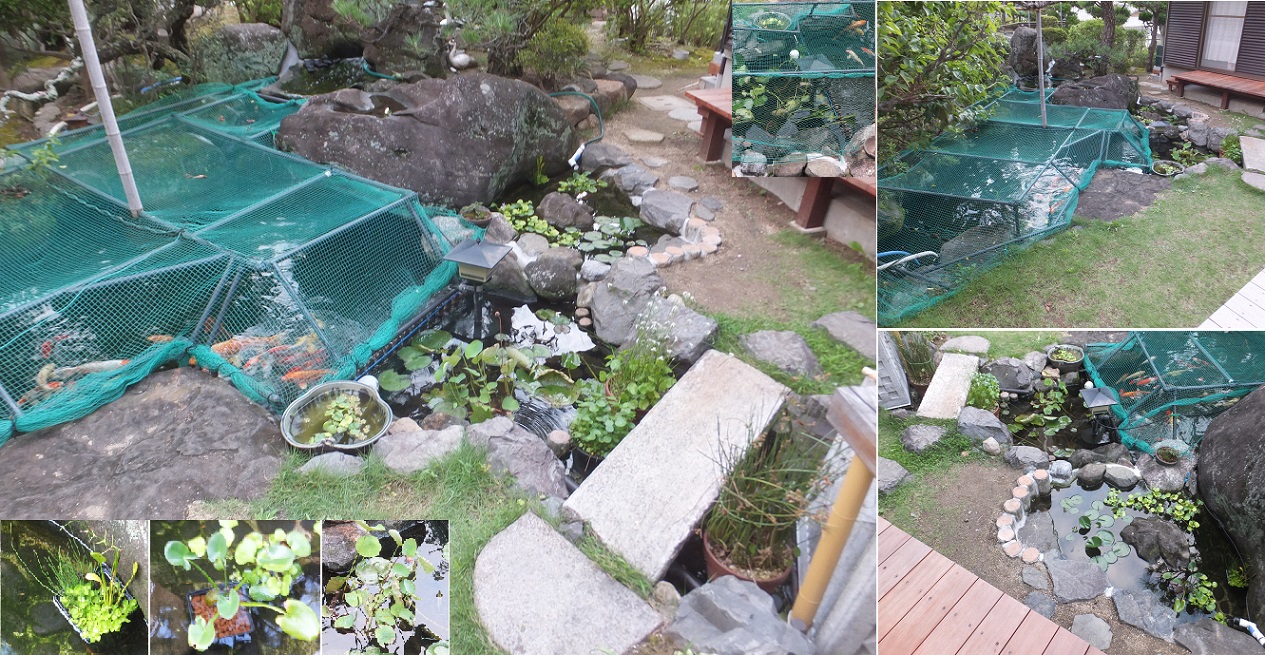 池のハスの垣根を外したところ、葉っぱを鯉にかじられて、見るも無残な姿になったので、再度垣根を設置したが、この蓮池には、鯉が入らないことがはっきりしたので、鳥よけのカバーをなくすことにした。