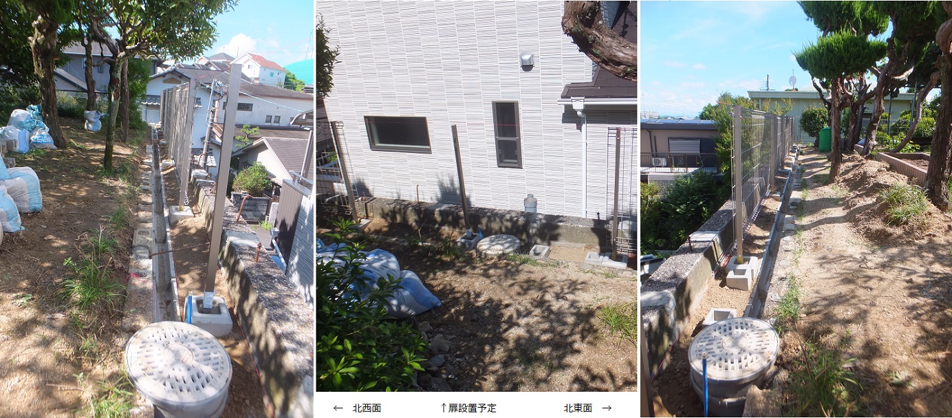昨日、側溝の設置が終わり、早朝から、コンクリートで、接続部分のコンクリート詰めを行い、北面の扉や、側溝の部材の準備ができていない部分の未完や、残存物の処理などは残っているが、一応フェンス工事が終了した。