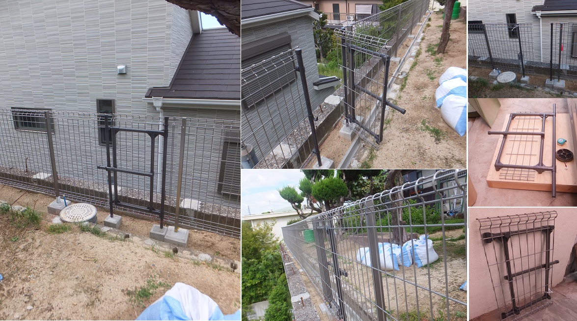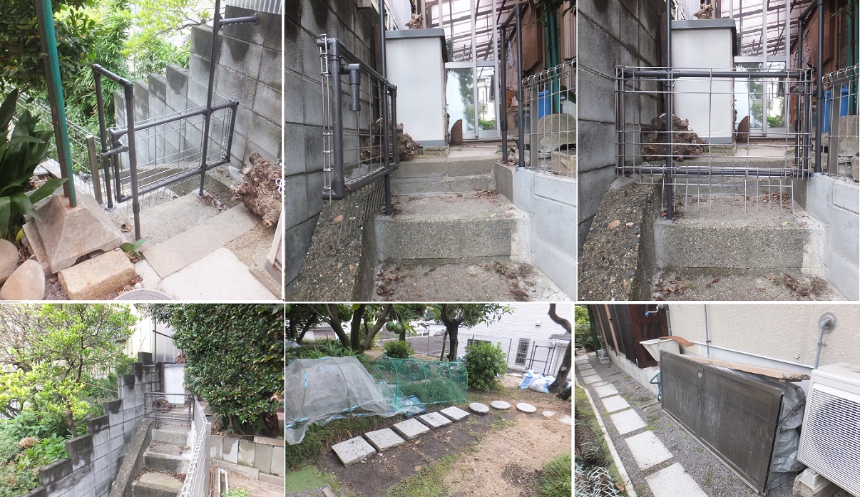 フェンスが出来上がり、残された裏階段の出入り口。鉄の網を置いただけの入り口であったので、今回フェンスの扉を参考に作り替えた。