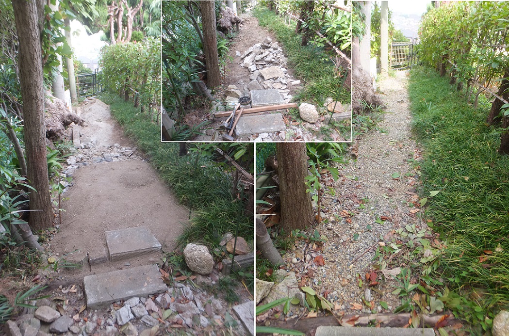 表面の石や土を一度横に置いて。そこのガレキを並べ、その上に除いた石や土を戻す。
