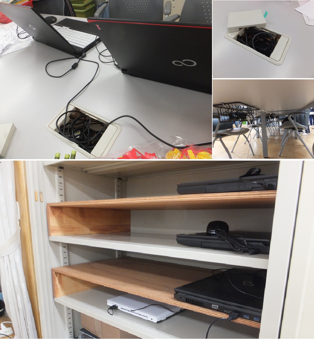 新規3台納入の近隣の保育所。当初訪問した時から気になったことがある。 ・パソコンを使用するときに、その都度、本体と電源アダプターと延長コードを出してパソコンを使用している。 ・ロッカーに入っている既存のパソコンが3台。今回追加した3台。合わせて6台になる。収納をどうすればよいか?