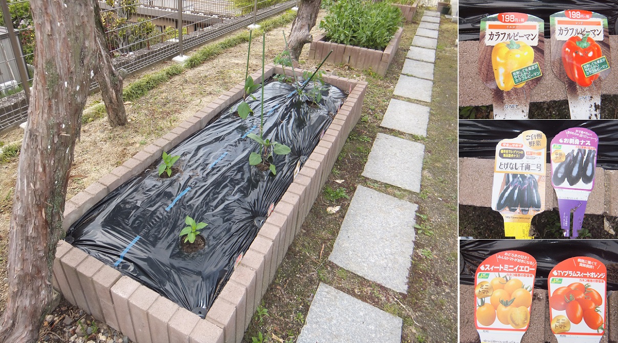 カラフルピーマン(イエロー・レッド) 茄子二種(とげなし千両二号、お刺身) ミニトマト(スイートミニイエロー、TYプラムスイートオレンジ)