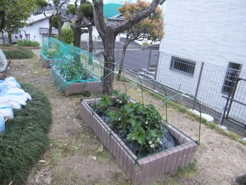 イチゴが、花をつけている。本来は、摘果したほうがいいのだが、そのままにしてしまった。さてどうなることか。
