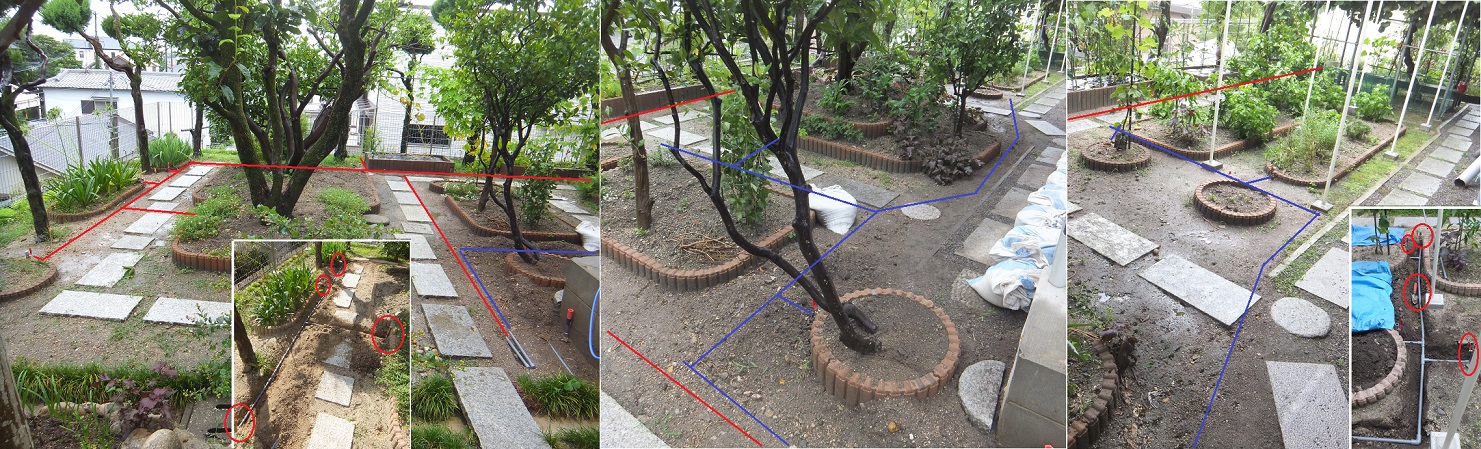 全体を花壇と菜園の二系統に分けて、それぞれ配管する。