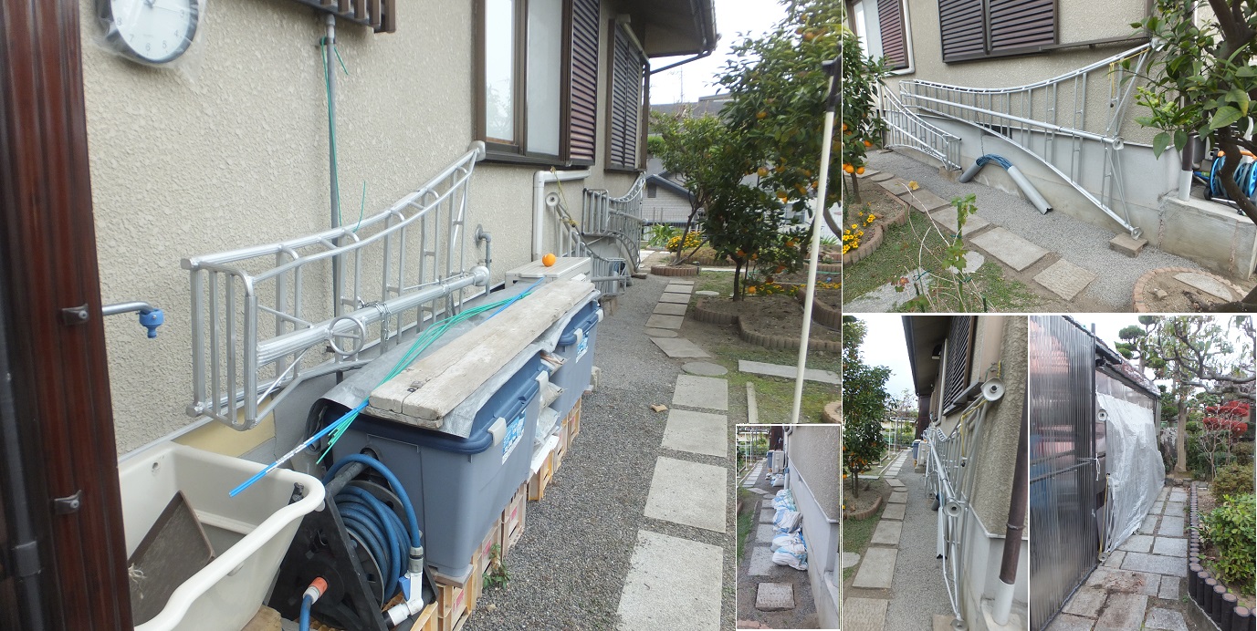 カーポートの前に重ねて置いていた剪定用の三脚。不透明な白いシートで囲っているため、見栄えが良くない。