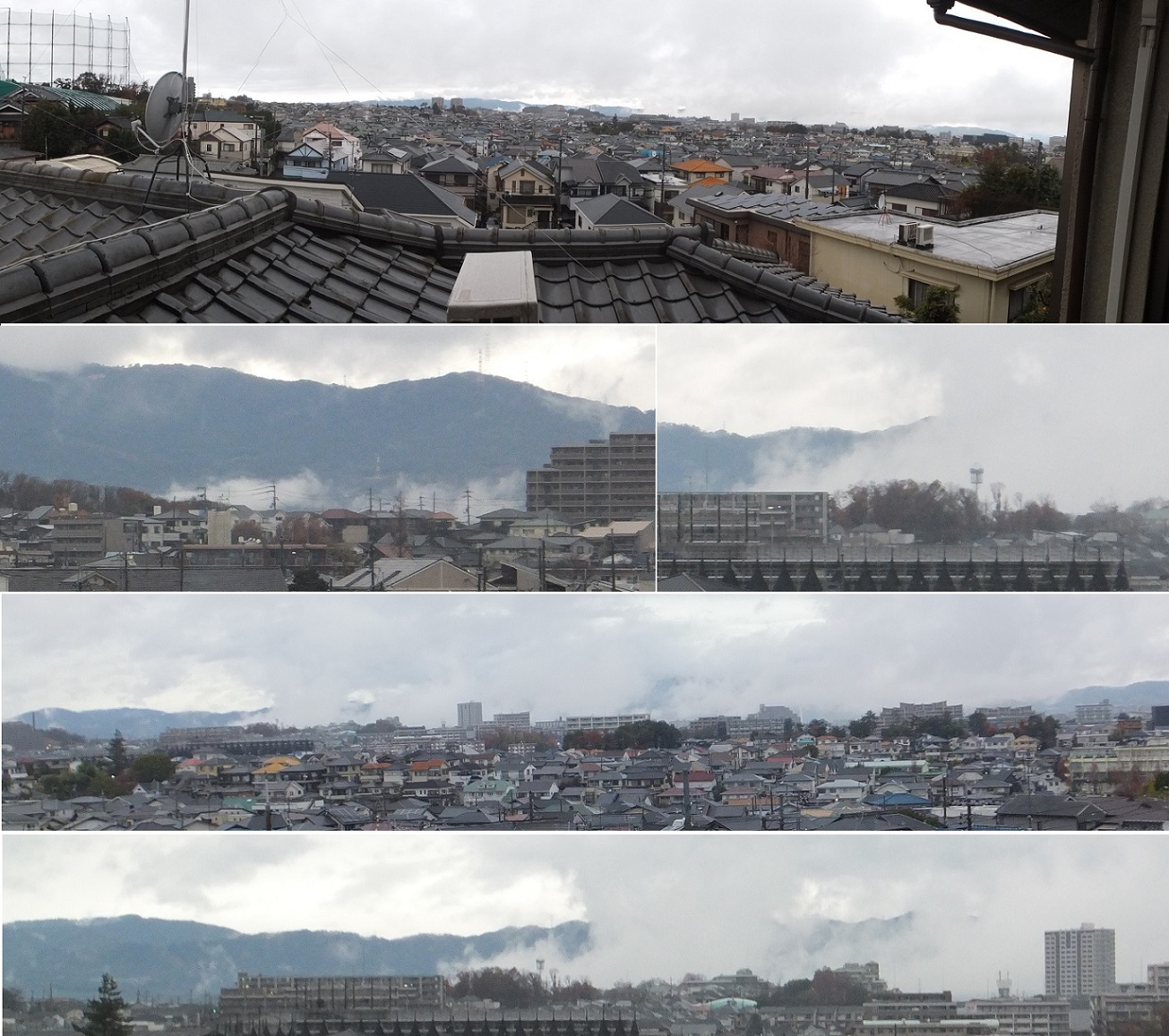 2階の北側の窓から見える北摂の山々。高槻の方向に雲が立ち上がっている。