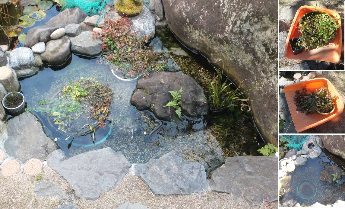 池の中の鉢を二つ外して、トリミング。 水の中にはびこっている藻を手で除く。 底から舞い上がったゴミは、池の方に流す。 しばらくほっておくときれいになる。