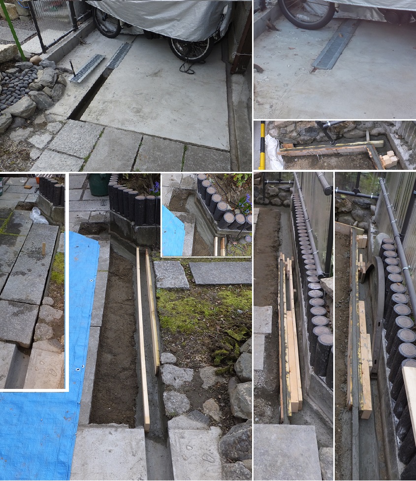 自転車置き場の横の敷石の部分が、雨になると浸水する。 前から気になっていたが、今回、バイク置き場を改築にあたり、これも併せて改善しようと、溝の製作に入る。