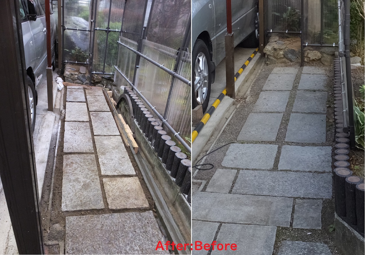 菜園で使用した敷石は底面が平らなため、割と施工しやすかったが、ここの敷石は、底面が割った状態で凸凹しており、また厚さがある。そのため重量もあり、施工が大変である。