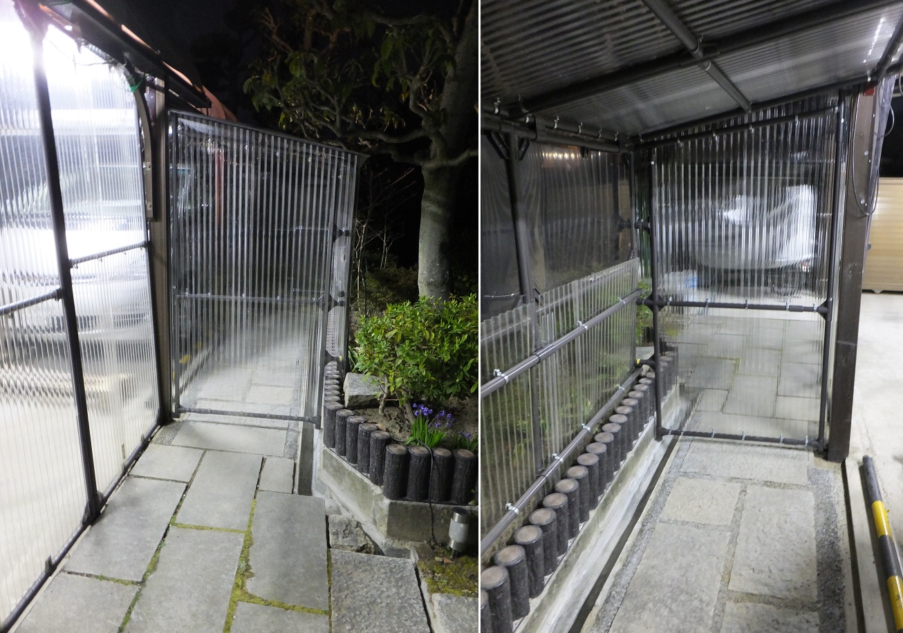 壁の上部の隙間には、パネルを張り、下部は、波板をそれぞれのサイズに合わせて切断。波板と金具の間に挟み込み隙間を無くすなどの対策を行い、完成。