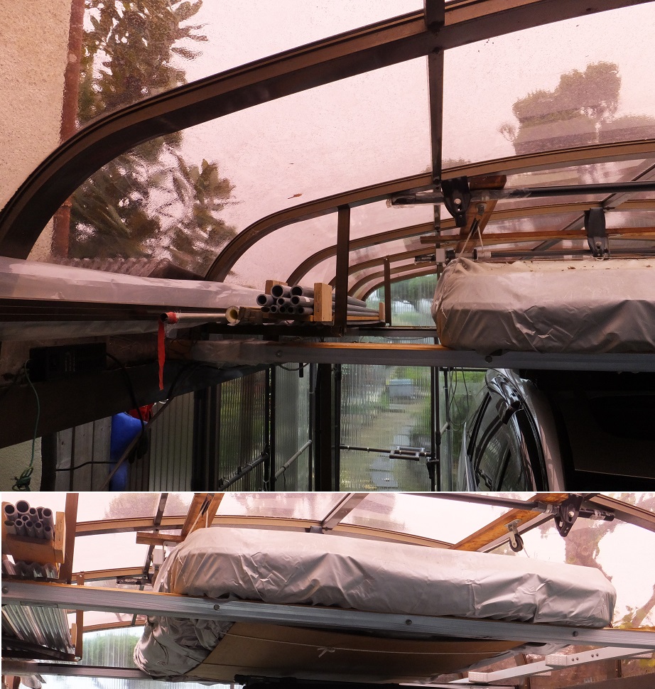 長尺物の置き場にカーポートのルーフテント置き場を利用していたが、ルーフテントの脱着がしやすいように、独自の物置を製作した。