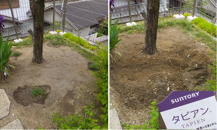 中の土を取り除き(土嚢1.5袋分)、焼き砂を入れて完成。