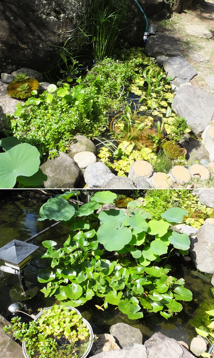 ビオトープに背丈の高いショロガヤツリとアンペライを追加祖ました。大きな石の前に、並べて・・・