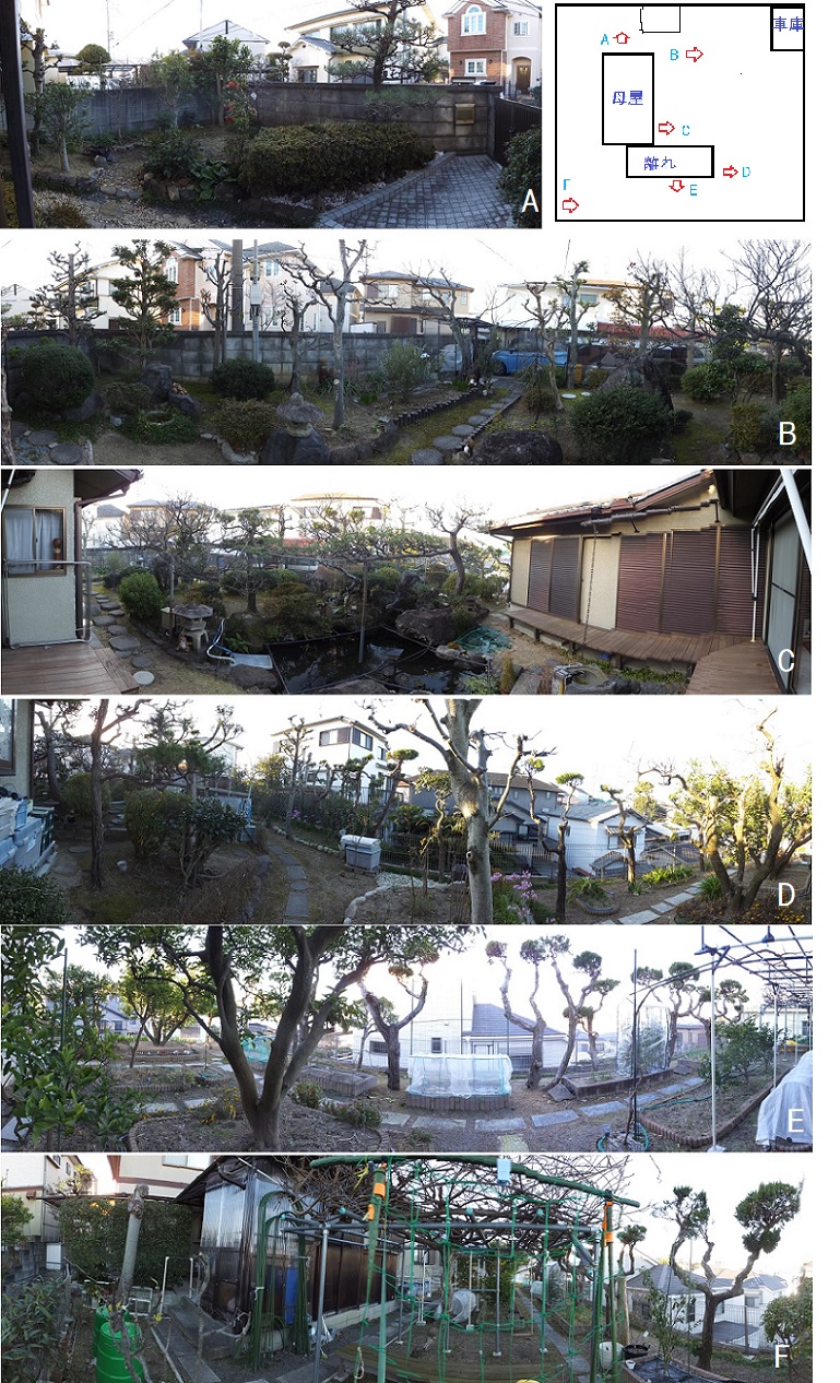 A・・・玄関 B・・・玄関から車庫方向 C・・・庭 池があります D・・・離れ西側 E・・・北側 菜園があります F・・・北側東端から西方向
