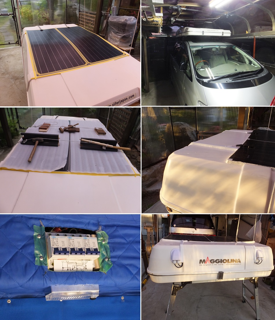 ルーフテントへのパネルの接着。引き込み線の配線工事。 ルーフテント内にスイッチ類を設置して、二枚あるパネルの接続方法を変える(並列化直列化)。