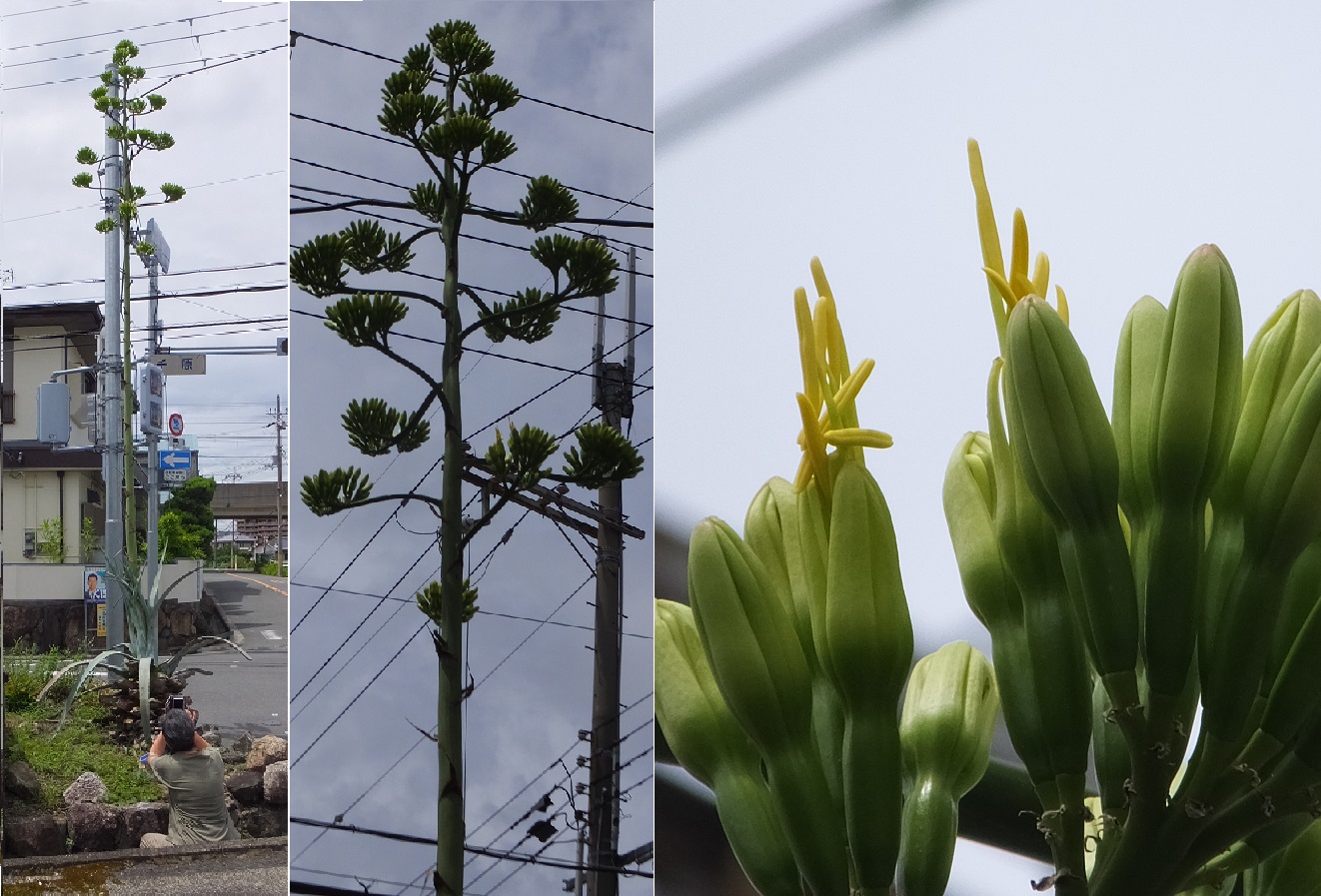 奈良の長久寺への墓参の道すがら、数十年に一度の開花といわれるリュウゼツランが咲いていた。行きの道で気が付いて、帰りには車を止めて観察を。