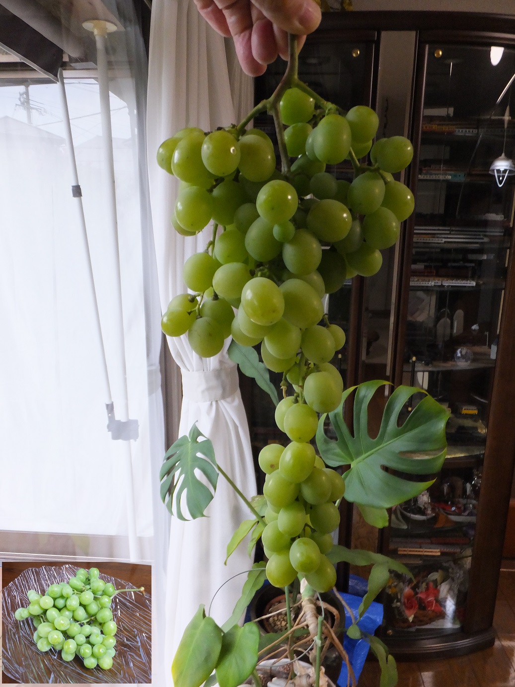 特にこの房は、実が沢山ついていたので摘果して40粒程度の減らすのが普通であるが、摘果がもったいなくてそのままにして、大きくした。