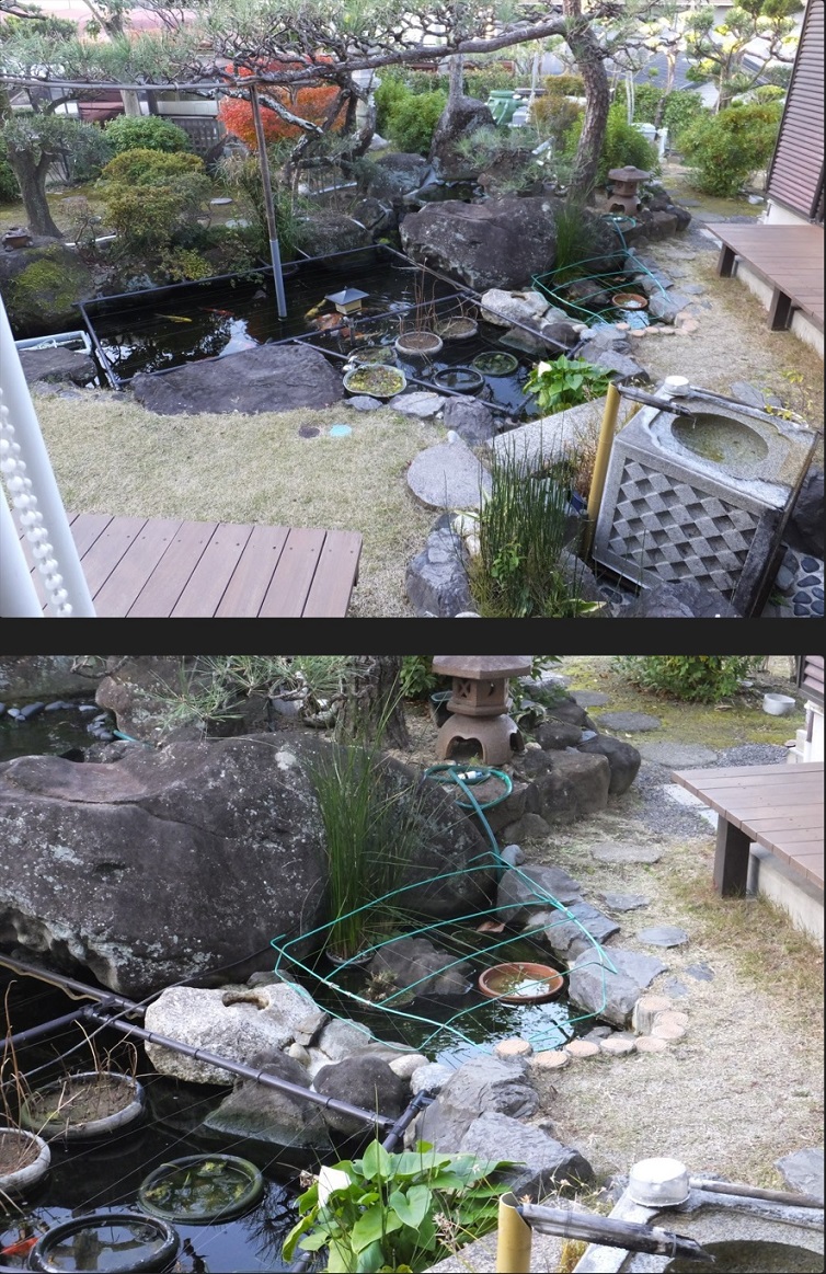ビオトープの緑色の網のカバーをテグスに変えてみました。