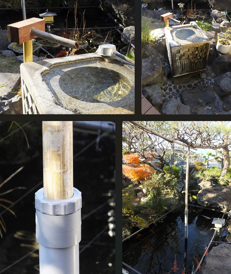 以前から消滅していた筧の頭。友人から竹を戴き、ウッドデッキの板を購入するときにこれも頂いた数種類のサンプルの木。 組み合わせて、穴をあけ竹を差し込む。と出来上がり。