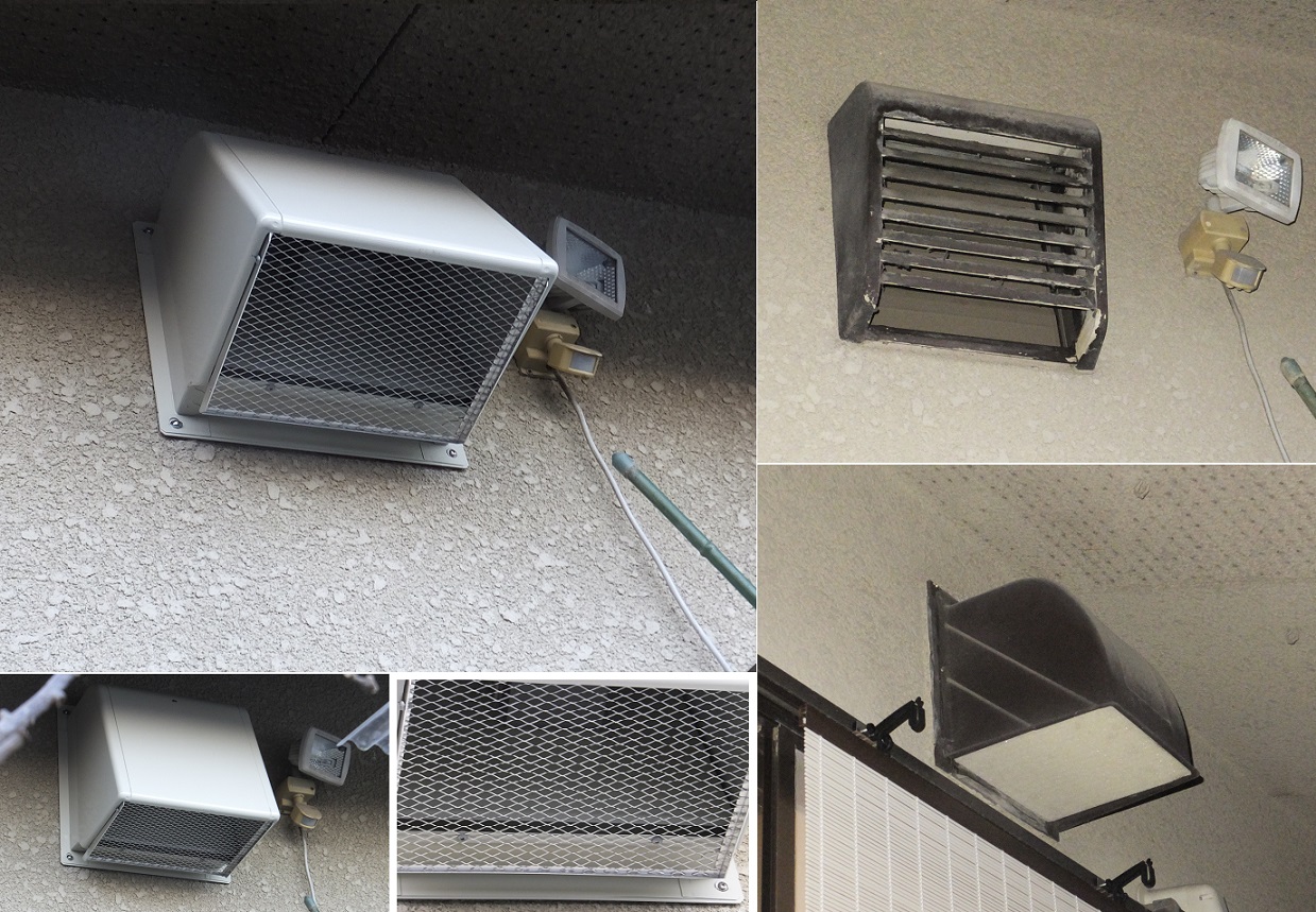 どうするか対策を考える。隣の居間にも換気扇がある。祖母が煙草を吸っていたのでつけた換気扇。家を建てる時につけ間違えた模様。 (写真の右上と右下)