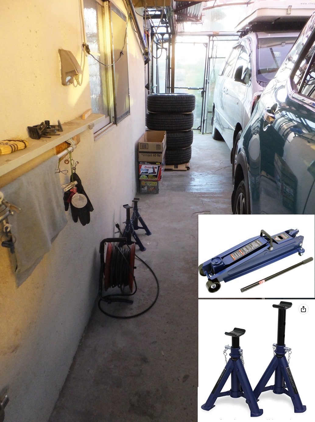昨年度のトラウマ(Estimaのタイヤ交換時、ジャッキが外れて、ボディに損傷を)から、馬(車の下に入れて安全にさぎょううぃする)を購入。早速ジャッキ手車体を持ち上げるが、馬が入らず。現2トン用から3トン用に買い替えて作業を行う。本来一日で終わるところ、馬の入手。キャッ期の交換など4日ほどかかってしまったが、無事完了した。