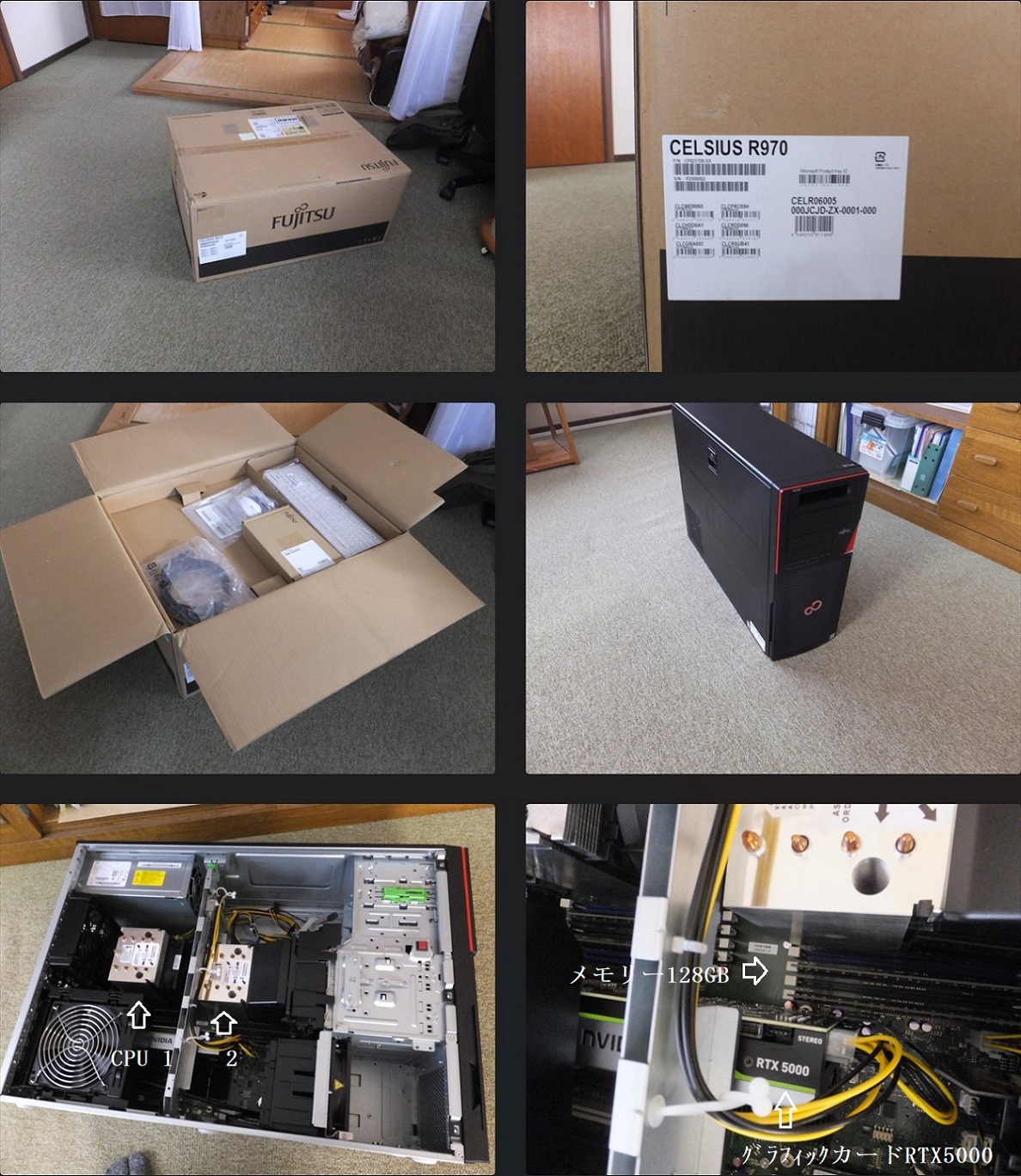 1.本体 ・・・富士通ワークステーションCELSIUS R970 : 850740) 2.CPU ・・この機種選別できる最高のものがついている。 (Xeon®Gold 6140 プロセッサー x2個 :1330560) 3.メモリー・・一般的には8・16GBで標準仕様で16GB (増強版16GB x 8個 128GB :2207700) 4.ストレージ・・ HDD500GBを変更して (500GB SSD(M2.フラッシュメモリーディスク : 129360) 5.グラフィックカード・・Quadro P400 から 変更して (NVIDIA Quadro RTX5000 : 489060)